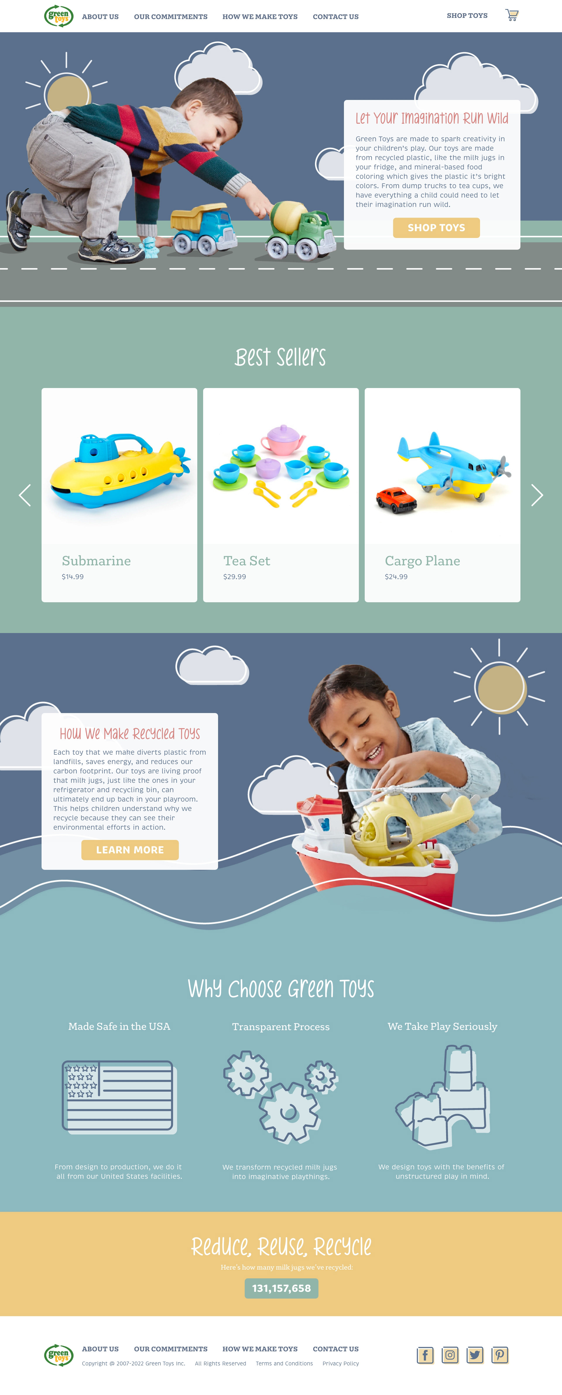 The Green Toys current website is a solid design; however, it did not feel fun or playful like a children's toy company should. For that reason, I chose to redesign their website to be more joyful and whimsical. I did this by creating a new energetic color palette and integrating illustrations with photos of their product.